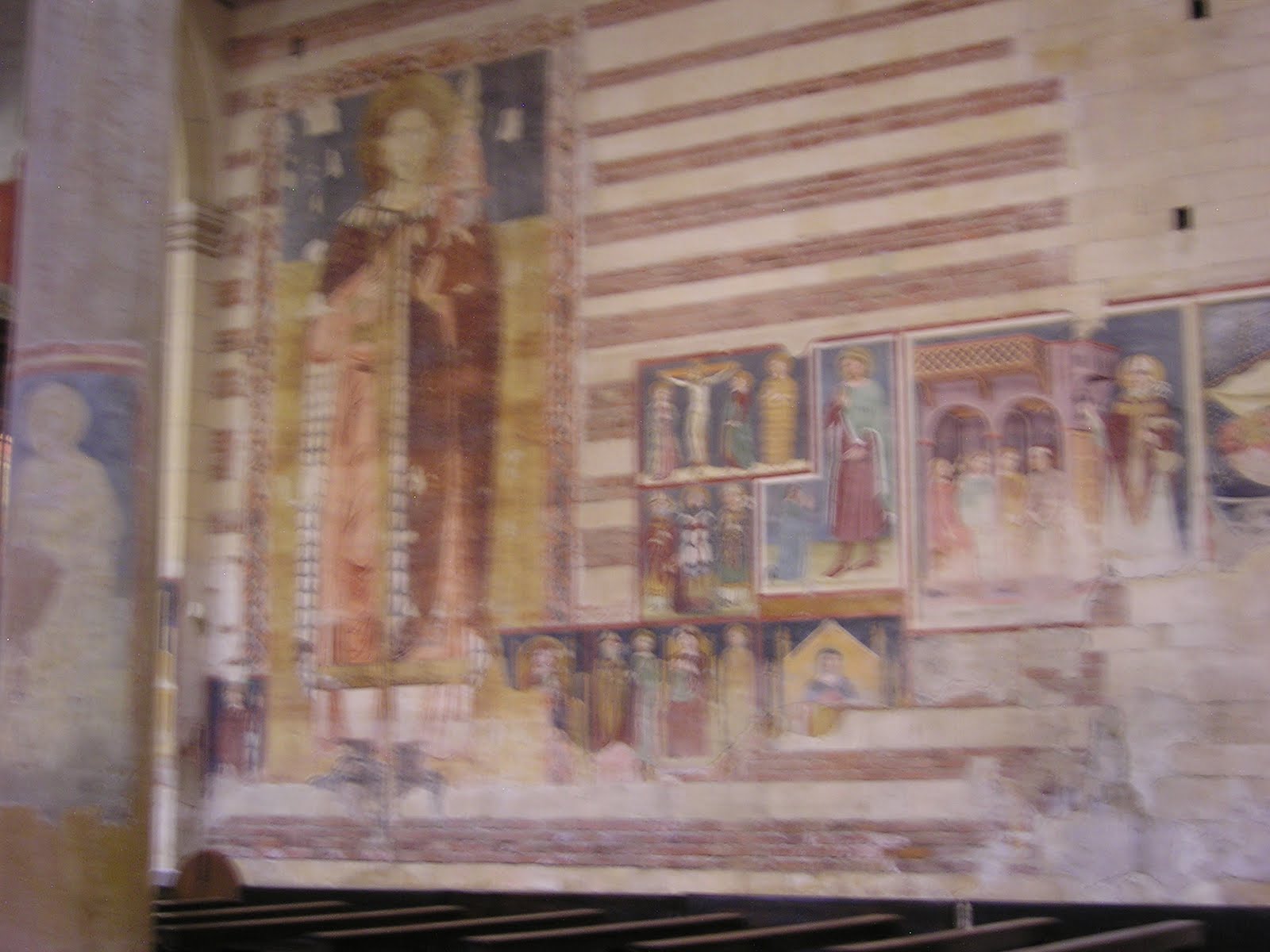 Today the fabulous A. led us to the basilica of San Zeno, which is the most beautiful thing I’ve seen in Verona so far. The original monument to San Zeno was built in the fourth century, shortly after his death; construction of the three-level structure that is the current basilica began in the 10th century, was destroyed by invaders and earthquakes, and was finally completed around 1380. The basilica was built on the site of the old Roman cemetery, in honor of the city’s patron saint, and has been remarkably well preserved. After the Scala family lost political control and Verona came under the power of the Republic of Venice, it also took control of San Zeno; the abbots of the basilica's monastery were all appointed by the Doge, but they lived most of the year in Venice, which meant they pretty much left the church grounds alone. On the one hand, this preserved all the artwork, including the extraordinary frescoes adorning nearly every wall; on the other hand, this meant the buildings were not well maintained, and the monastery itself collapsed in the early 19th century (I think! just for the record, I don't take notes during these tours :-). The church grounds, which are extremely large, represent only one-third the area of the medieval complex.